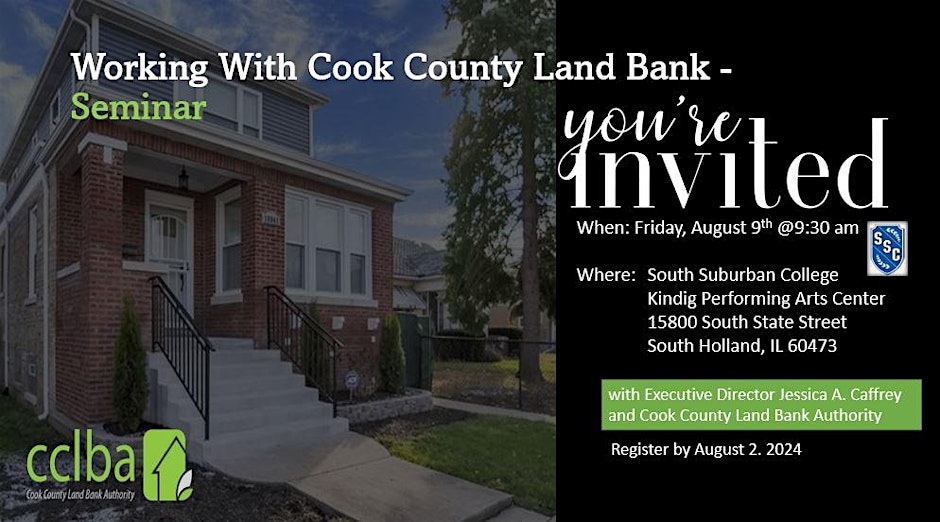 The Cook County Land Bank is hosting a seminar to discuss how to work with the Cook County Land Bank and apply for property! This event is open to the public and we encourage anyone who wants to do business with the Land Bank to attend. The registration deadline is August 2nd, 2024.